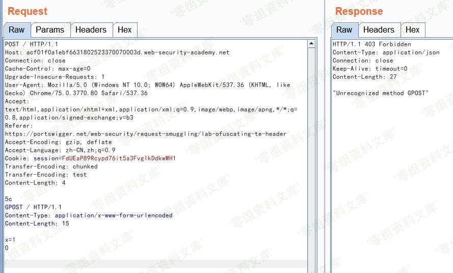 本质上因为前后端服务器对TE头解释不一致导致请求走私,可视作是TE-CL或CL-TE;经过测试,本实验中应该属于TE-CL。