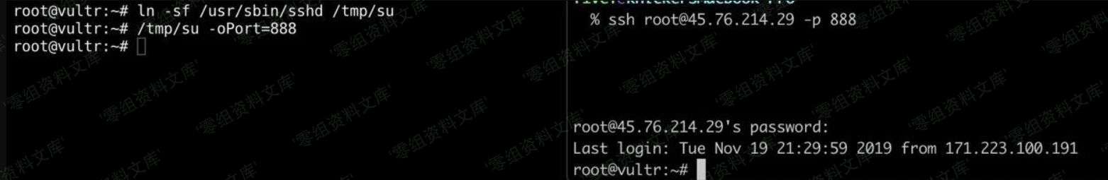 软连接后门的原理是利用了PAM配置文件的作用,将sshd文件软连接名称设置为su,这样应用在启动过程中他会去PAM配置文件夹中寻找是否存在对应名称的配置信息(su),然而su在pam_rootok只检测uid 0即可认证成功,这样就导致了可以使用任意密码登录。
