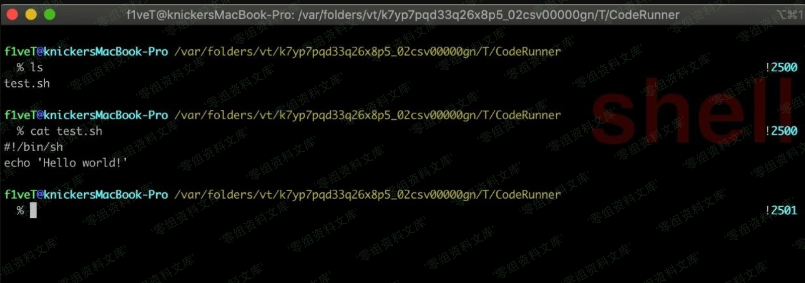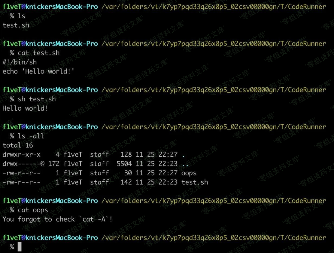 使用coderunner生成了一个test.sh脚本。cat看了下脚本的内容是echo一个hello world! 且同目录下只有他本文件。然后我们用sh test.sh执行后。