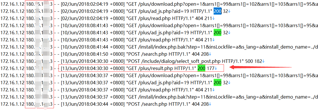 `172.16.1.12 180.xx.xxx.3 – – [10/Jun/2018:08:41:43 +0800] “GET /plus/ad_js.php?aid=19 HTTP/1.1” 200 32`