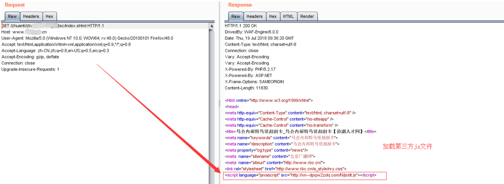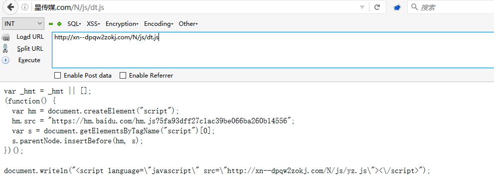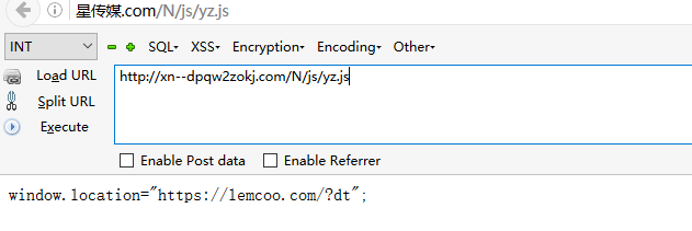 可以发现此时这个返回页面已被劫持,并且加载了第三方js文件,http://xn--dpqw2zokj.com/N/js/dt.js,进一步访问该文件: