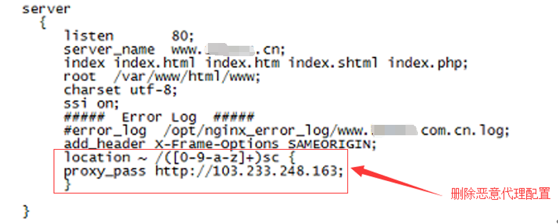 对Nginx配置文件进行排查,发现Nginx配置文件VirtualHost.conf被篡改,通过反向代理匹配以“sc”后缀的专题链接,劫持到