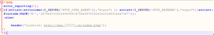 通过对index.php文件进行代码分析,发现该文件代码 对来自搜狗和好搜的访问进行流量劫持。