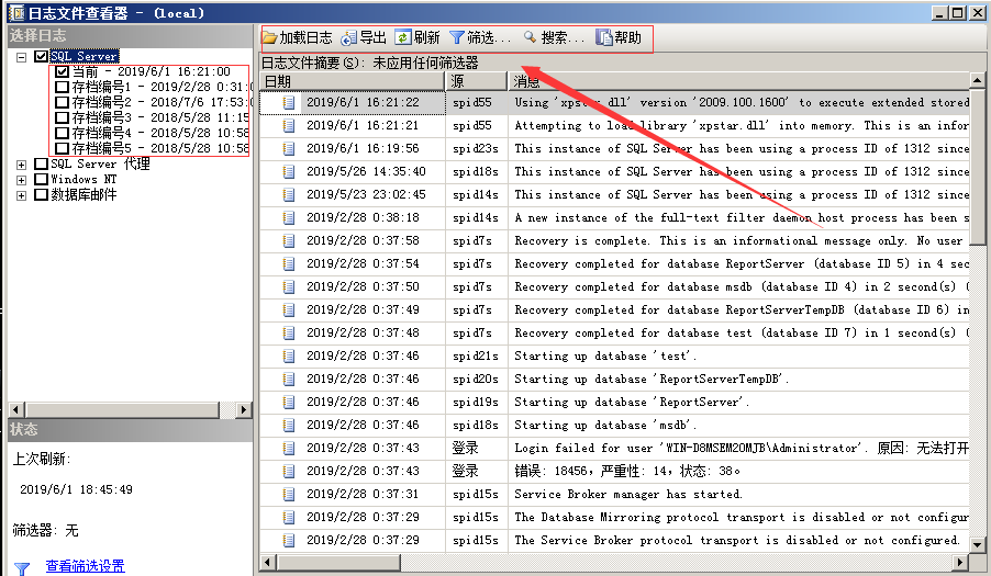 登录到SQL Server Management Studio,依次点击 管理–SQL Server 日志
