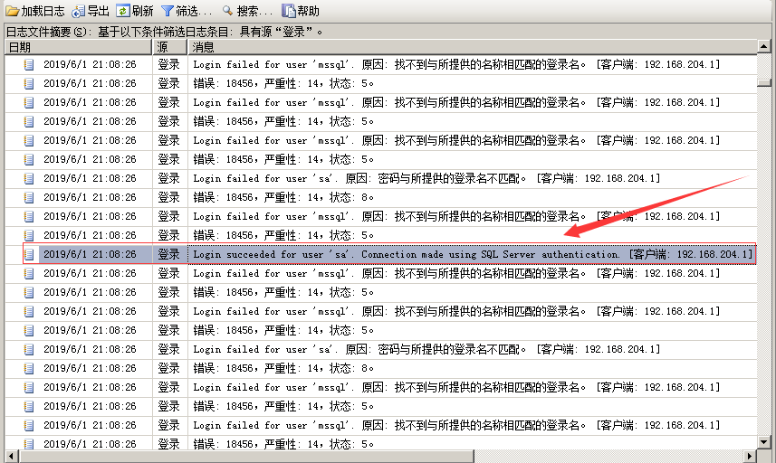 如下图:客户端:192.168.204.1进行尝试弱口令登录,并发现其中有一条登录成功的记录。