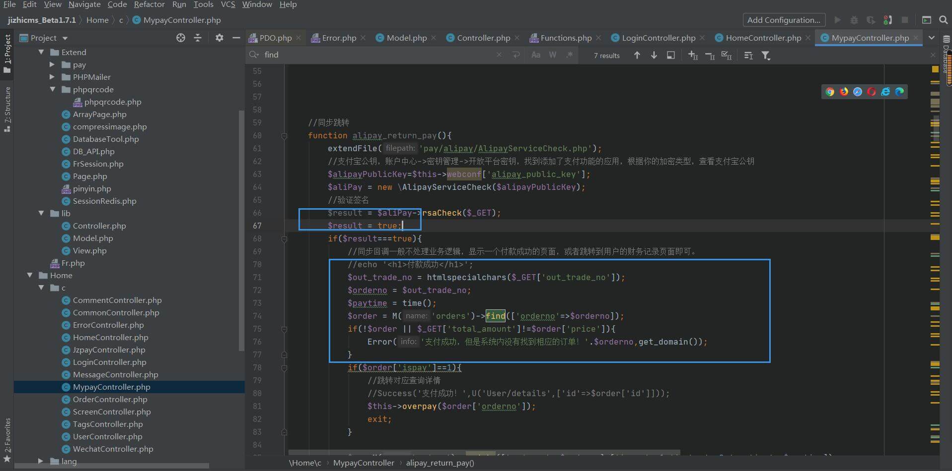 这里是一个支付插件的位置,蓝色方块1增加代码模拟开通支付宝功能通过验证