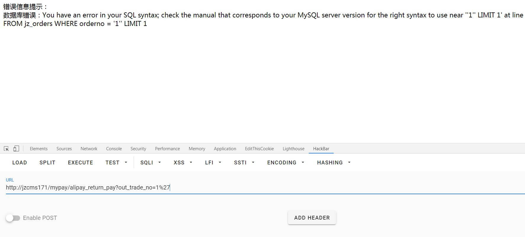可以看到的确出现了sql语句和数据库错误