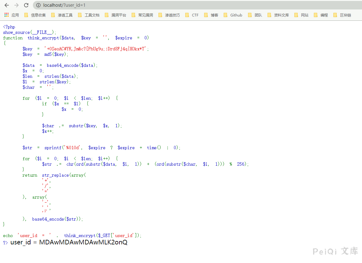 for ($i = 0; $i < $len; $i++) { if ($x == $l) { $x = 0; } $char .= substr($key, $x, 1); $x++; } $str = sprintf('%010d', $expire ? $expire + time() : 0); for ($i = 0; $i < $len; $i++) { $str .= chr(ord(substr($data, $i, 1)) + (ord(substr($char, $i, 1))) % 256); } return str_replace(array( '+', '/', '=' ), array( '-', '_', '' ), base64_encode($str)); } ``` **解密方法 think_decrypt** ```php function think_decrypt($data, $key = '') { $key = md5(empty($key) ? config('database.data_auth_key') : $key); $data = str_replace(array( '-', '_' ), array( '+', '/' ), $data); $mod4 = strlen($data) % 4; if ($mod4) { $data .= substr('====', $mod4); } $data = base64_decode($data); $expire = substr($data, 0, 10); $data = substr($data, 10); if ($expire > 0 && $expire < time()) { return ''; } $x = 0; $len = strlen($data); $l = strlen($key); $char = $str = ''; for ($i = 0; $i < $len; $i++) { if ($x == $l) { $x = 0; } $char .= substr($key, $x, 1); $x++; } for ($i = 0; $i < $len; $i++) { if (ord(substr($data, $i, 1)) < ord(substr($char, $i, 1))) { $str .= chr((ord(substr($data, $i, 1)) + 256) - ord(substr($char, $i, 1))); } else { $str .= chr(ord(substr($data, $i, 1)) - ord(substr($char, $i, 1))); } } return base64_decode($str); } ``` 全局查看下使用了解密方法的地方 在文件 **application\common.php** 中含有使用解密方法的代码,用于做身份验证 ```php function is_login() { $user = session('user_auth'); if (empty($user)) { $cookie_uid = cookie('user_id'); if (!empty($cookie_uid)) { $uid = think_decrypt($cookie_uid); $userinfo = getUserInfo($uid); D('common/User')->autoLogin($userinfo);