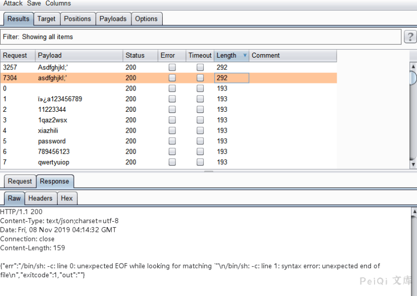 当burpsuite爆破完成时,注意到POST数据中如果带有 ;’ ,响应数据包发生异常。