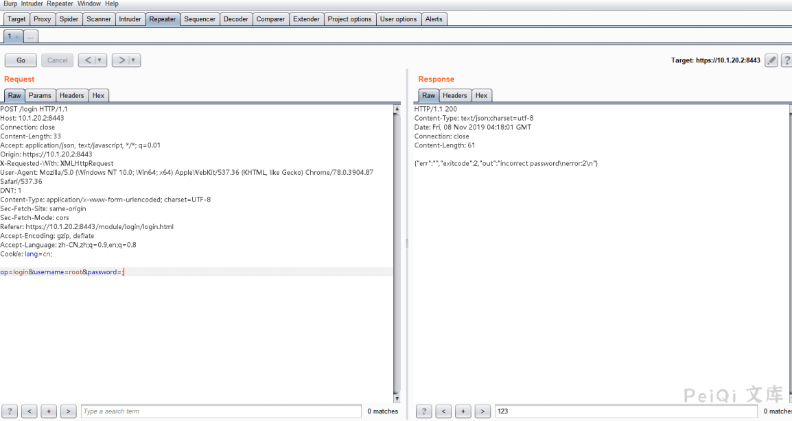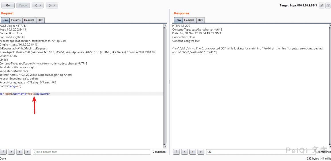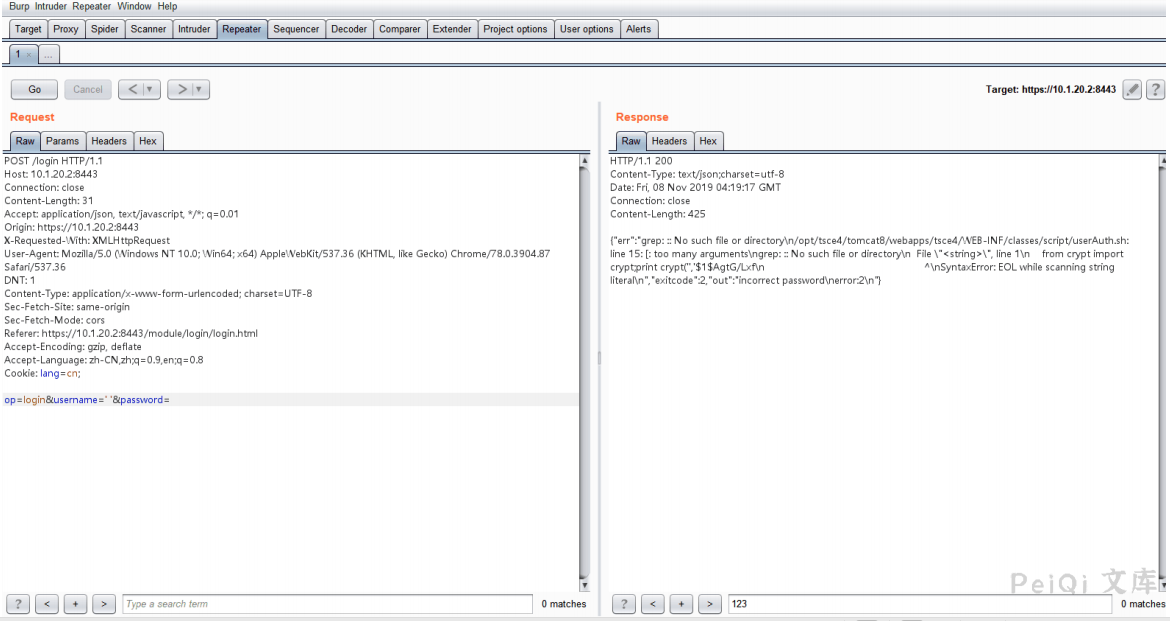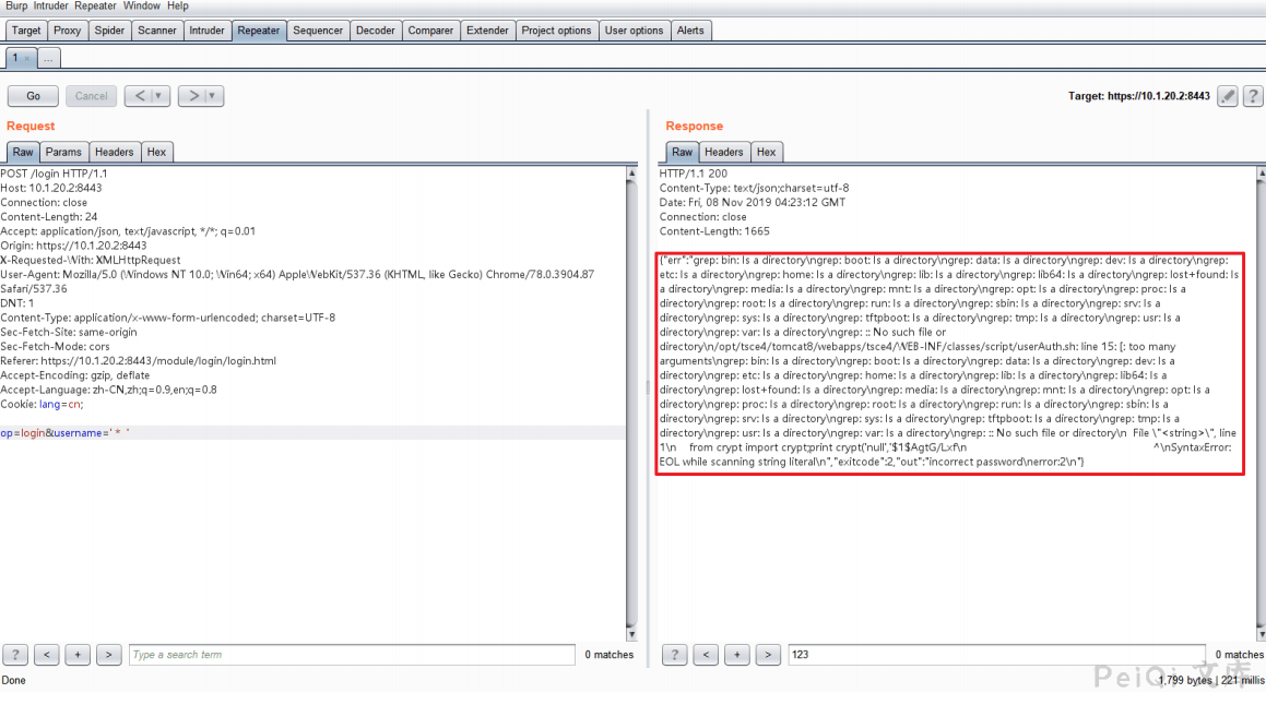 通过响应包信息,猜测可能存在一个远程执行代码漏洞,并将此数据包放在repeater中,我发现如果发布数据中有