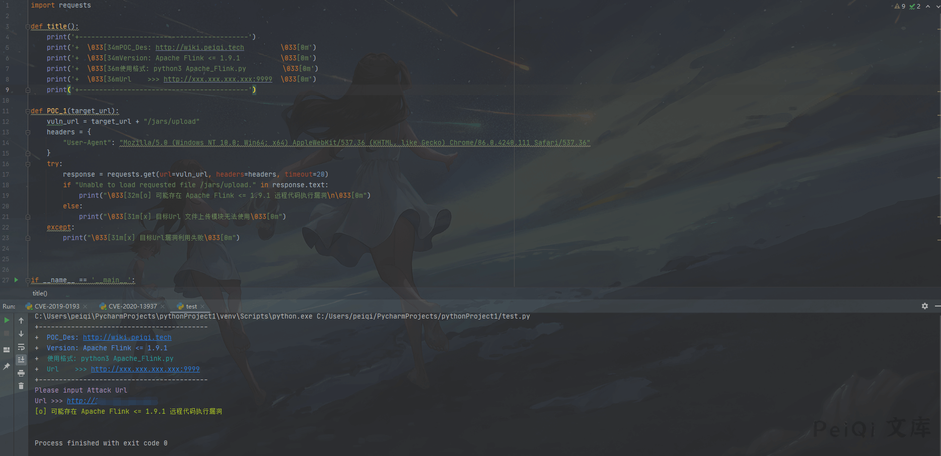print(“\033[32m[o] 可能存在 Apache Flink <= 1.9.1 远程代码执行漏洞\n\033[0m")