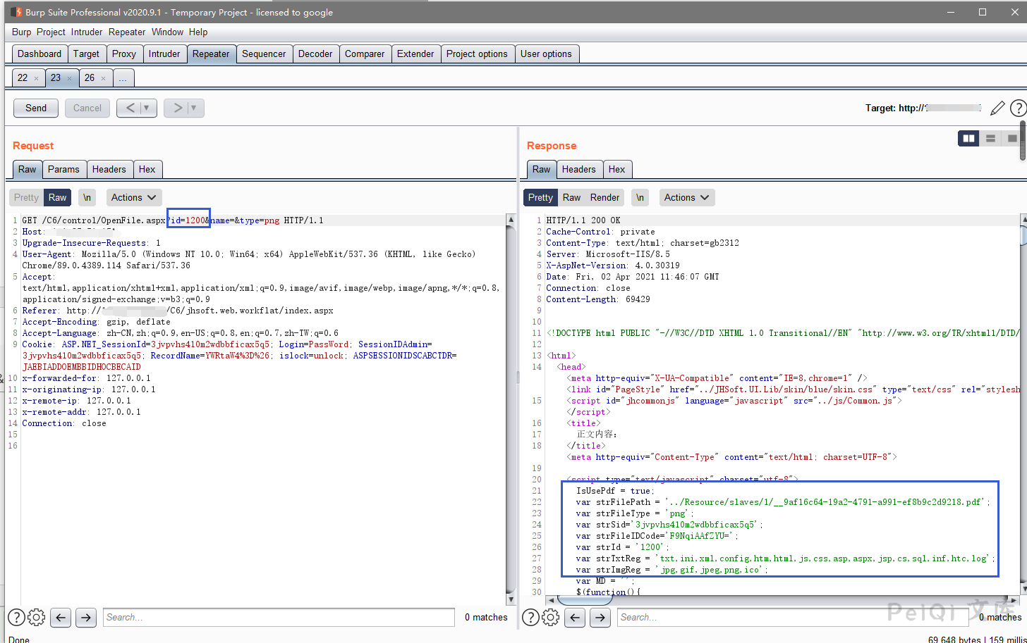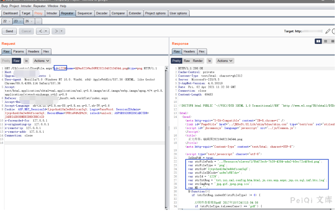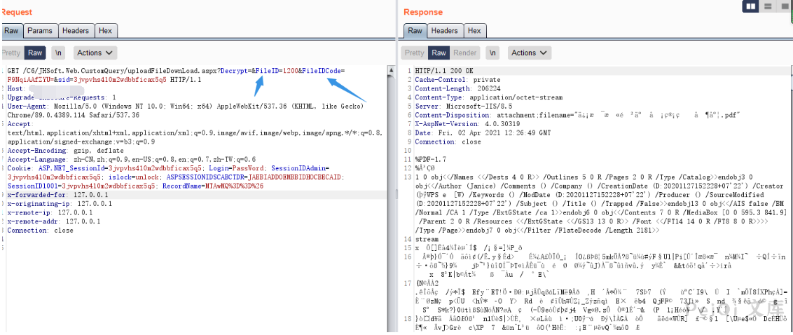 其中我们注意到 strFilePath 为文件的存储地址,我们更改 id参数为另一个值,且测试后发现 name文件名参数无关紧要
