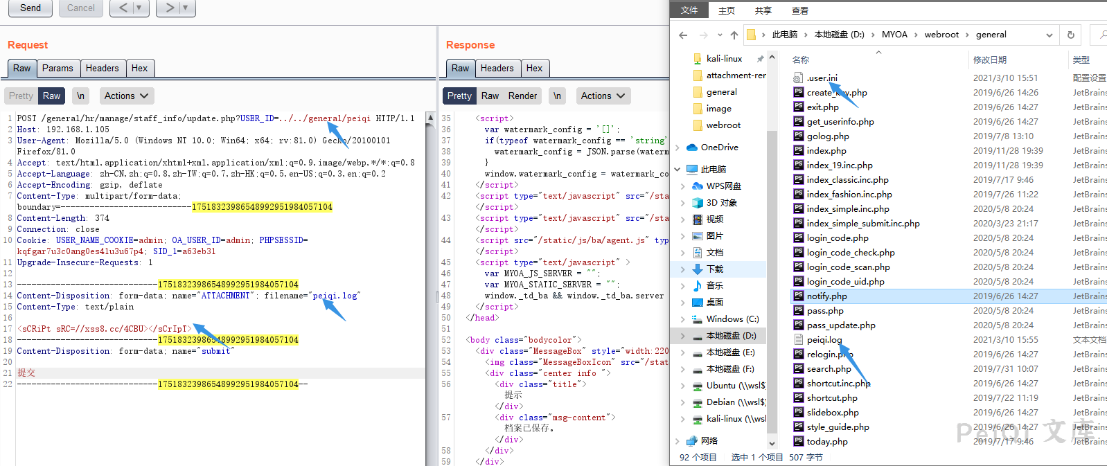 这里再上传 XSS文件 **peiqi.log** 被包含进去