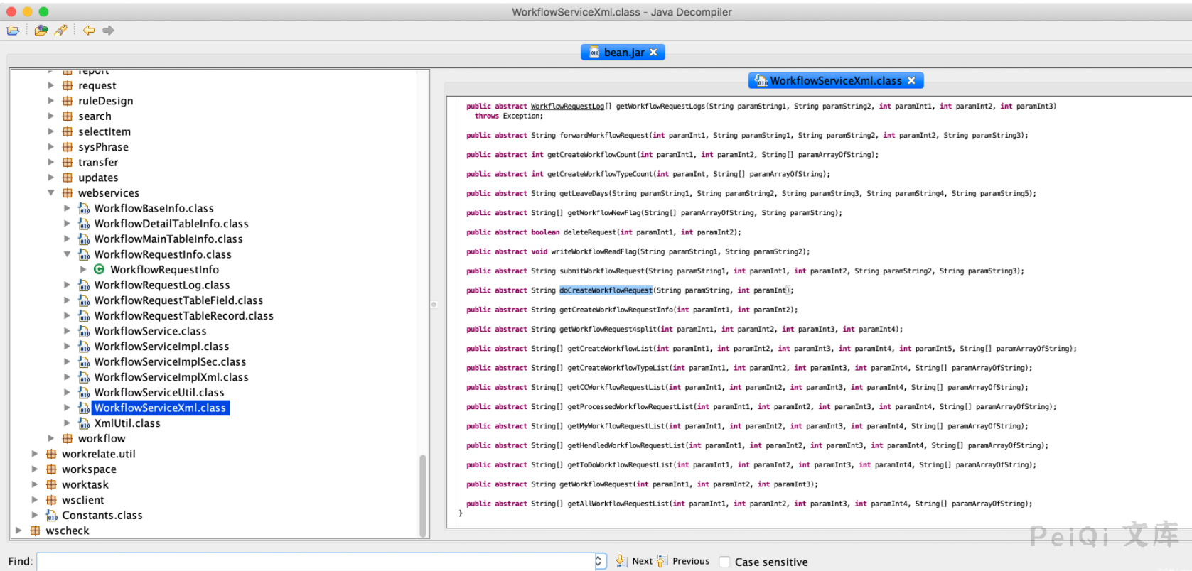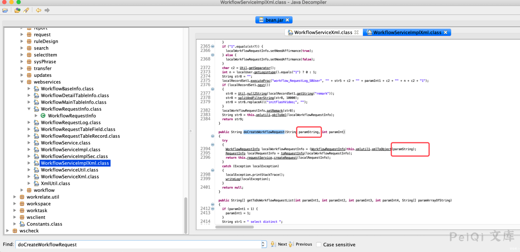 可以注意到这是一个接口类,其中一个方法`doCreateWorkflowRequest`比较可疑。