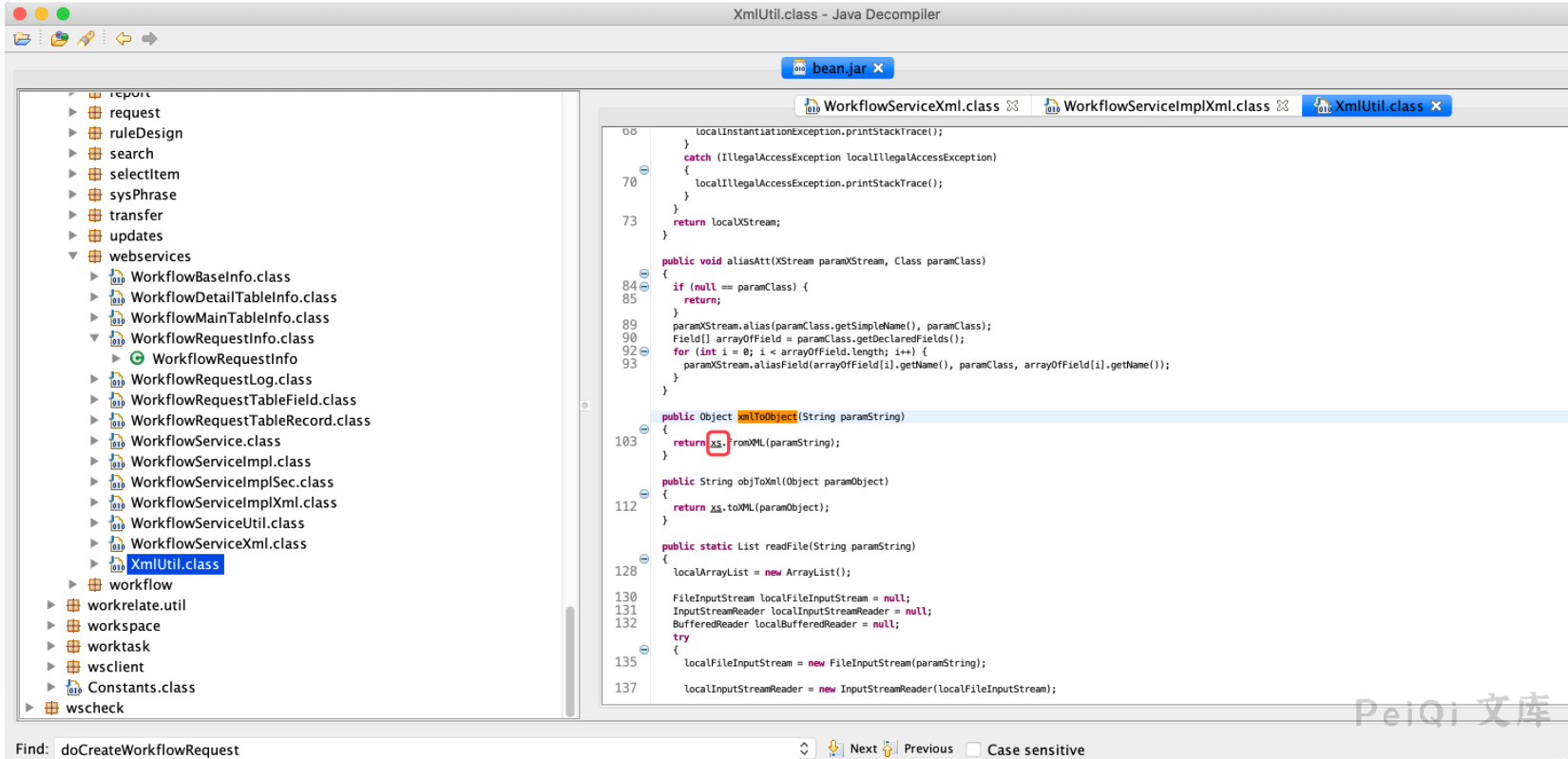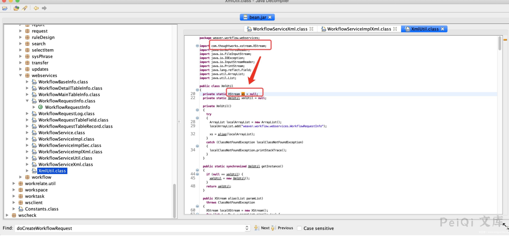 发现了相关类为`weaver.workflow.webservices.WorkflowServiceXml`、`weaver.workflow.webservices.WorkflowServiceImplXml`。