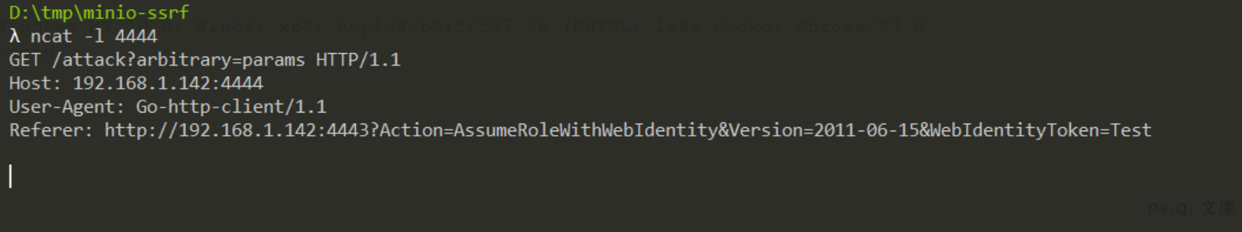 我们来实际测试一下,向`http://192.168.227.131:9000`发送如下请求,其中Host的值是我本地ncat开放的端口(`192.168.1.142:4444`):