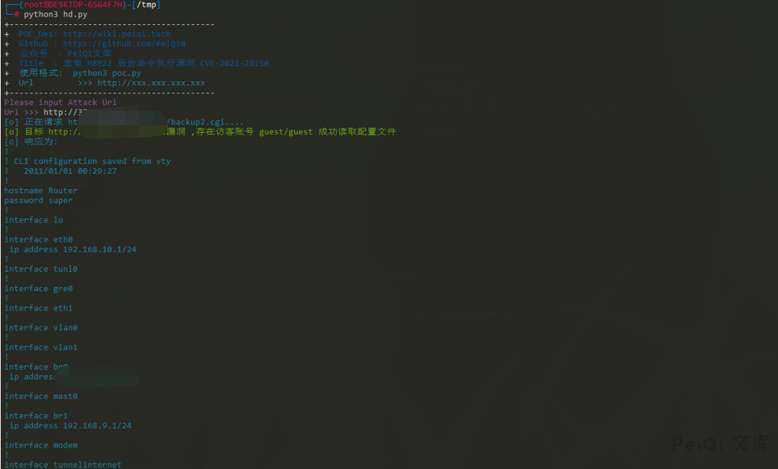 print(‘+ \033[34mTitle : 宏电 H8922 后台管理员信息泄露漏洞 CVE-2021-28151 \033[0m’)