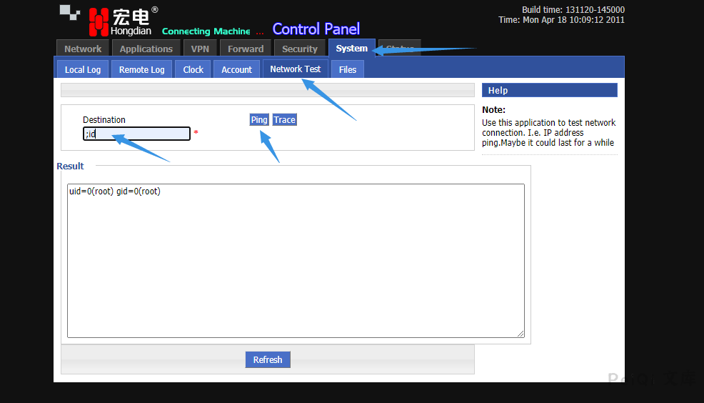 宏电 H8922 后台中的网络测试模块中存在命令执行漏洞。通过命令拼接执行任意命令