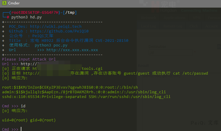 print(‘+ \033[34mTitle : 宏电 H8922 后台命令执行漏洞 CVE-2021-28150 \033[0m’)