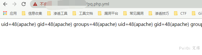 这里写入文件 **test.php.yml**,并使用 **../** 跳出限制的目录,访问 test.php.yml 实际访问了 test.php,执行id命令