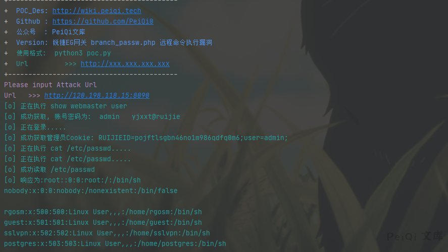 print(“\033[36m[o] 成功获取管理员Cookie: {} \033[0m”.format(ruijie_cookie))